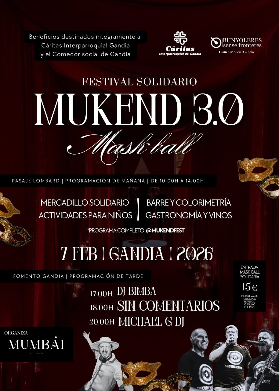 Gandia volverá a convertirse en epicentro de la solidaridad el próximo sábado 7 de febrero con la celebración de la tercera edición del Mukend Fest, un evento benéfico que reunirá durante toda la jornada actividades culturales, música en directo y propuestas familiares con un objetivo claro: recaudar fondos para Cáritas Interparroquial de Gandia y el Comedor Social.