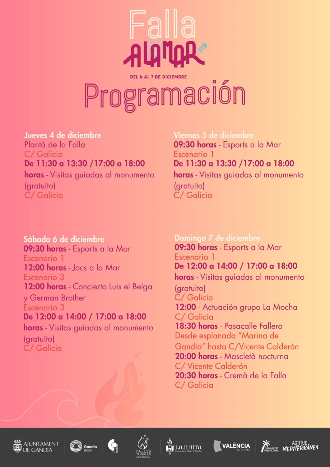 El domingo 7 de diciembre continuará la combinación de deporte y fiesta con nuevas sesiones de ‘Esports a la Mar’ y la actuación del grupo La Mocha al mediodía. A las 18:30 horas se celebrará el Pasacalles Fallero, que partirá desde la explanada de la Marina de Gandia, seguido a las 20:00 horas por una mascletà nocturna en el Grau. La cremà de la falla, a las 20:30 horas, cerrará la edición de este año.