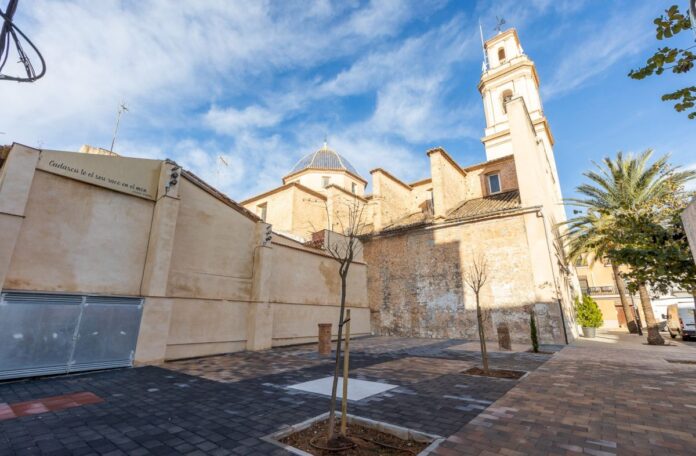 El alcalde de Gandia, José Manuel Prieto, y el presidente de la Junta de Distrito de Beniopa, Jesús Naviero, han visitado esta mañana el espacio para comprobar el resultado de una intervención que suma alrededor de 200 metros cuadrados de superficie pública junto a la iglesia de Santa María Magdalena, catalogada como Bien de Relevancia Local.