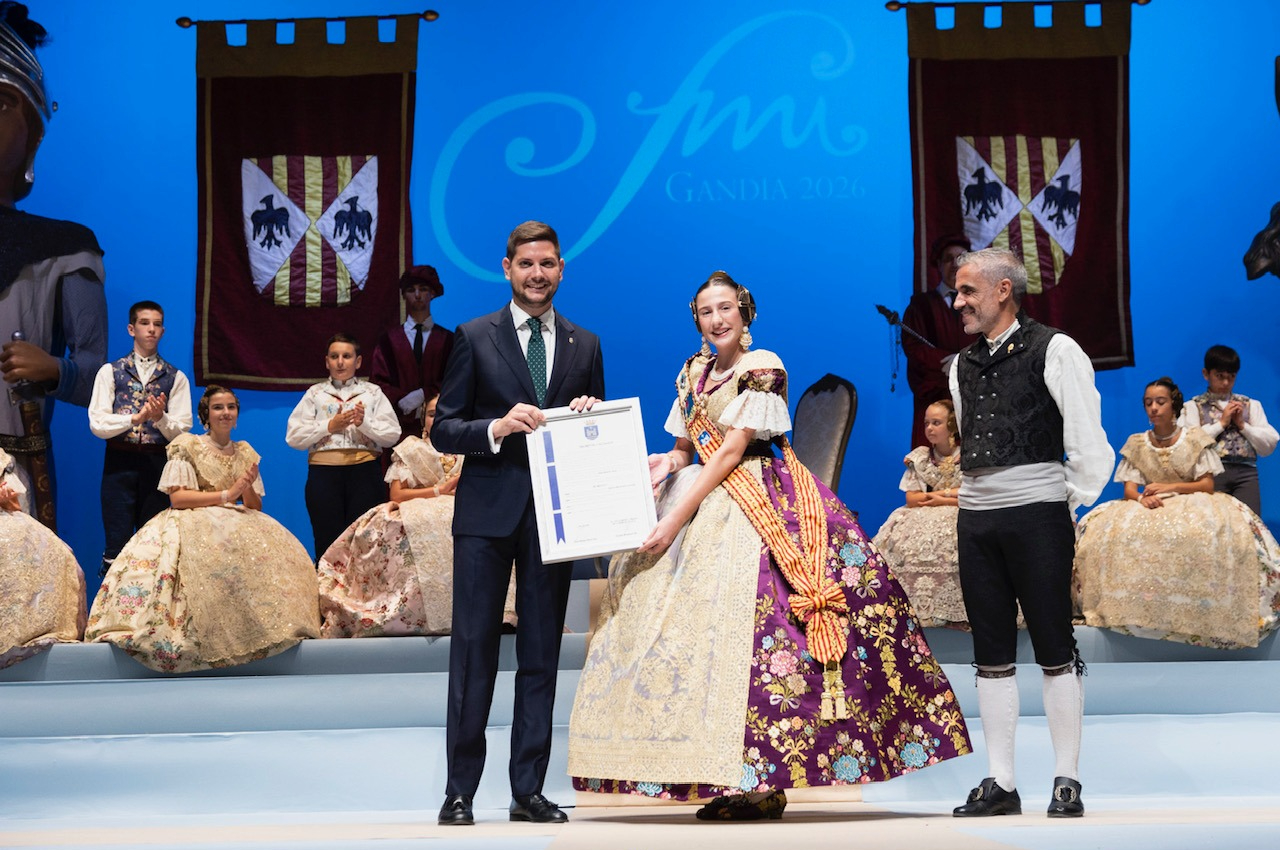 La noche del sábado fue el turno de Manuela Borrull Guillem, proclamada como Fallera Mayor de Gandia 2026 en un acto multitudinario. El alcalde le entregó el decreto de la Alcaldía que la acredita como máxima representante de las Fallas de la capital de la Safor, en una ceremonia donde la mantenedora fue Liliana Requena.