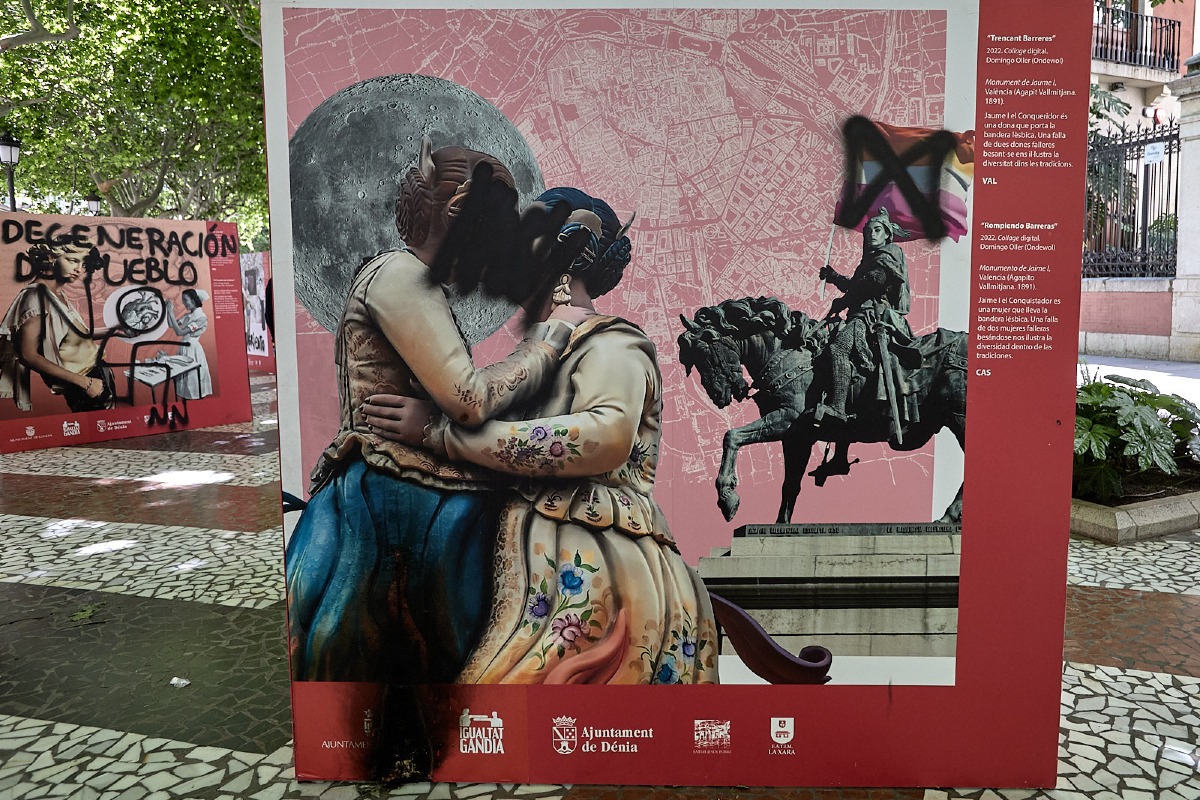 Las imágenes del beso entre dos falleras, banderas del orgullo o representaciones femeninas no normativas fueron dañadas con pintadas ofensivas como “degeneración del pueblo”, “puteros” y esvásticas sobre símbolos del colectivo. Incluso se intentó borrar los rostros y las identidades que representan a miles de personas.