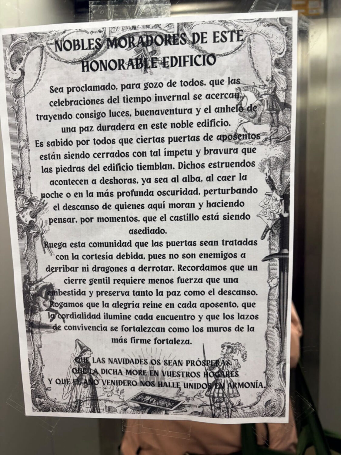 El aviso, colocado en el ascensor del edificio, pide evitar los portazos con humor y lenguaje medieval