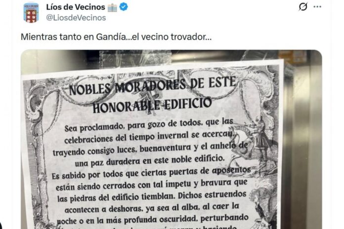 La convivencia vecinal suele generar pequeños conflictos cotidianos, pero en un edificio de Gandia uno de ellos ha sido abordado con una dosis inesperada de creatividad. Un vecino ha colocado un cartel en el ascensor para denunciar los portazos reiterados, utilizando un lenguaje propio de la épica medieval.